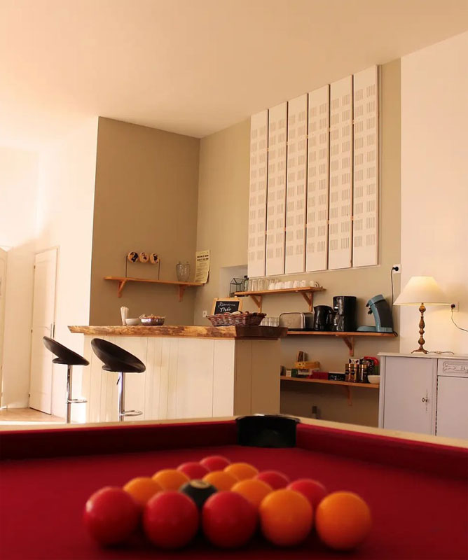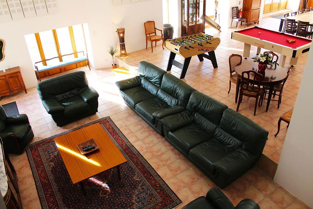 - 1 grande salle au rez-de-chaussée, d'environ 120 m² ; elle comprend un espace repas pouvant accueillir jusqu'à 15 personnes, un bar pour 6 personnes, un espace jeux avec billard et baby-foot, ainsi qu'un coin salon confortable pour regarder la télévision