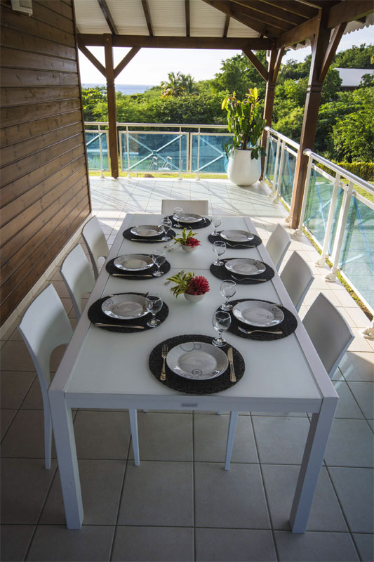 - 1 véranda de 15m² avec vue mer, cuisine équipée, salon extérieur de 5 places et table à manger de 6 places