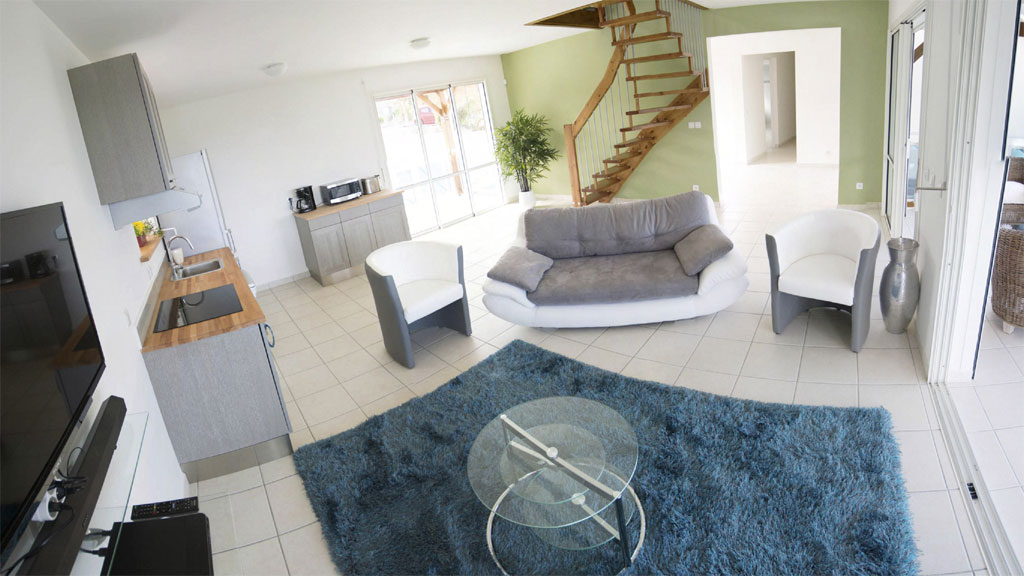 - 1 salon / cuisine américaine avec son passe-plat vers la véranda principale, équipé d'un salon télévision avec home cinéma
